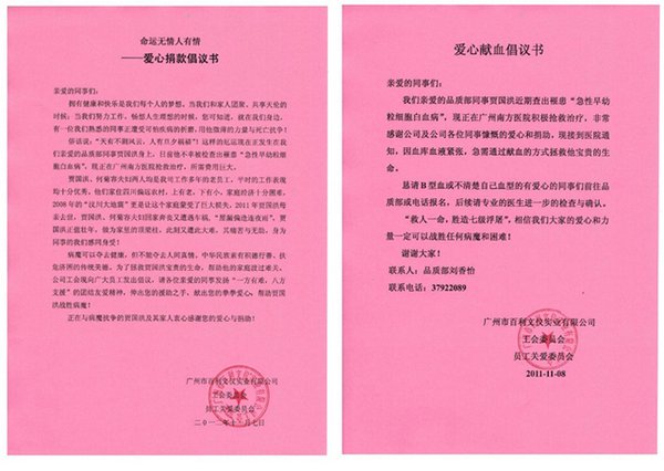 在百利集团旗下品质部工作了十余年的一优秀员工,于近期查出“急性早幼粒细胞白血病”,并在广州南方医院抢救治疗。病魔无情人有情,为了帮助同事早日战胜病魔,百利集团旗下的“员工关爱委员会”及百利旗下全体员工为此展开爱心捐献。到2012年11月8日截止,共筹集善款34690元。 爱心捐款、献血倡议书 员工捐款现场 员工捐款现场 募捐爱心榜